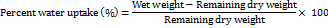 Previously weighed prepared tablets were kept in phosphate buffer pH 6.8 for 24 h. After 24 h wet tablets were again weighed and kept for drying. Percent water uptake was calculated by using the following formula [14]