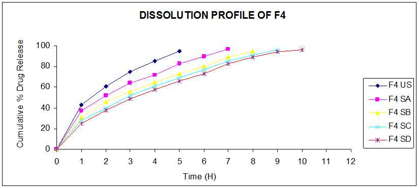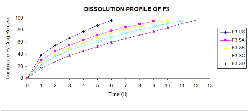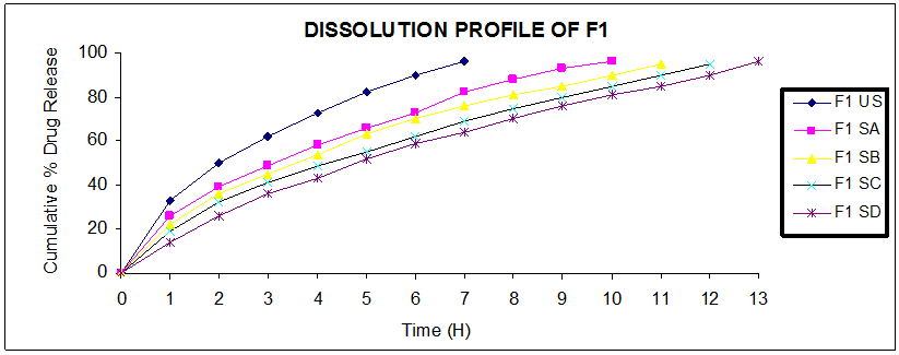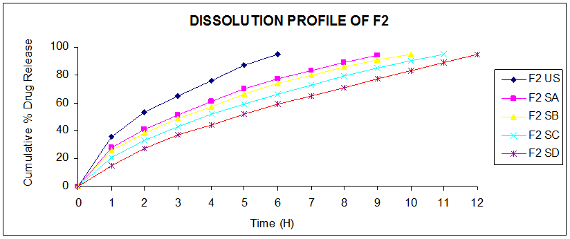 The f2 similarity factor given by SUPAC (scale-up and post-approval changes) guidelines for an extended-release dosage form was used as a basis for comparing dissolution profiles. The similarity factor f2 measures the closeness between two profiles. When the two profiles are identical, f2=100. An average difference of 10% at all measured time points results in an f2 value of 50. The Food and Drug Administration (FDA) has set a public standard of f2 value between 50 and 100 to suggest a similarity between two dissolution profiles. The dissolution profile of formulations was compared using the f2 value, which was calculated by using following the formula