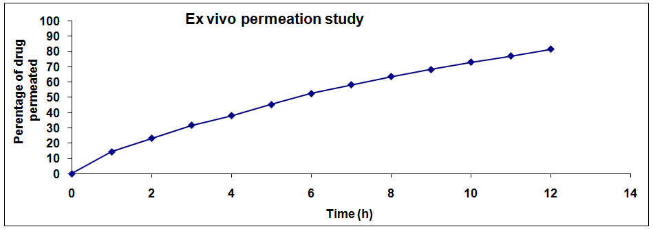 The optimized formulation F3SD was subjected to an ex-vivo buccal permeation study on fresh sheep buccal mucosa using modified Franz diffusion cell. The results of the ex vivo permeation study of mucoadhesive buccal tablets of ivabradine revealed that ivabradine was released from the tablet and permeated through sheep buccal membrane and could perhaps permeate through the human buccal mucous membrane. The drug permeation from the mucoadhesive buccal tablet through the sheep buccal mucosa was observed to be steady and 81.6% of ivabradine permeated in 12 h.
