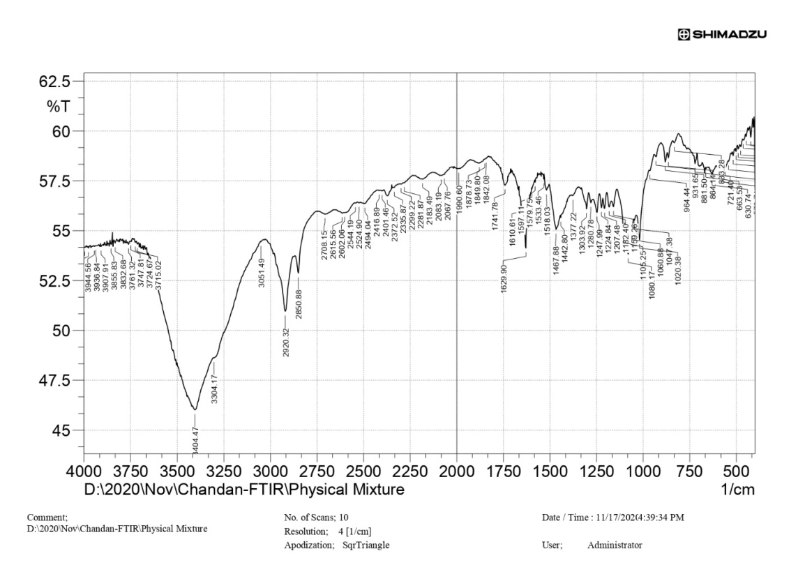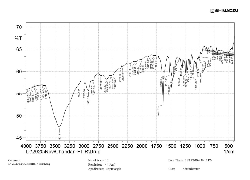 To identify the compatibility between Drug-polymer-excipient, The Fourier transform Infrared (FTIR) studies were performed on the pure drug, drug-polymer mixture, and optimized formulation, using IR spectrophotometer by potassium bromide (KBr) pellet method in the region between the range of 4000 to 400 cm-1.