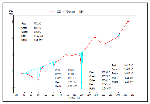 The pure drug i.e., ivabradine HCL and the mixture of drugs with various polymers were subjected to the DSC study. Samples of 2.241 mg were heated in an atmosphere of nitrogen at a heating rate of 10 °C/min in a closed aluminum pan over a temperature range from 20 °C to 330 °C. For all the studies nitrogen was used as a pure gas, at the flow rate of 50 ml/min.