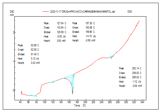 In this present study, the prepared unsintered tablets are exposed to thermal treatment at three different temperatures like 50 °C, 60 °C, and 70 °C. But sintering at 70 °C resulted in slight browning of the prepared tablets. Hence sintering was carried out at 50 °C and 60 °C for two different periods like 1.5 h and 3 h in a hot air oven. These temperatures were below the melting point of drug ivabradine HCL (198.30 °C, as shown in DSC studies) and polymers (170-180 °C and 80-88 °C for HPMC [25] and Carnauba wax [25] respectively).