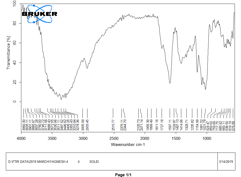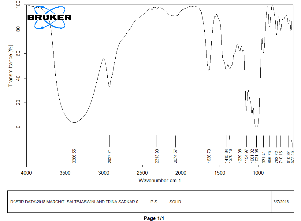 FTIR spectra of starch glycolate were recorded on samples prepared in Potassium Bromide (KBr) disks using a BRUKER FT–IR, (Tokyo, Japan). Samples were prepared in (KBr) disks by means of a hydrostatic press at 6-8 tons pressure [12]. The scanning range was 500 to 3000 cm-1.