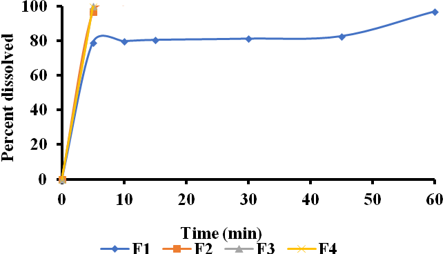 The in vitro dissolution rate studies of glipizide Fast Dissolving Tablets were performed using 8 stage dissolution test apparatus (Electrolab TDT-08L) fitted with paddles (50 rpm) at 37±0.5 °C, using 7.4 phosphate buffer (900 ml) as a dissolution media. At the predetermined time intervals, 5 ml samples were withdrawn, filtered through 0.45µ membrane filter, diluted and assayed at 275 nm using a shimadzu UV/Visible double beam Spectrophotometer. Cumulative percentage release was calculated using standard absorbance from the calibration curve. All the dissolution experiments were conducted in triplicate (n = 3) [14].