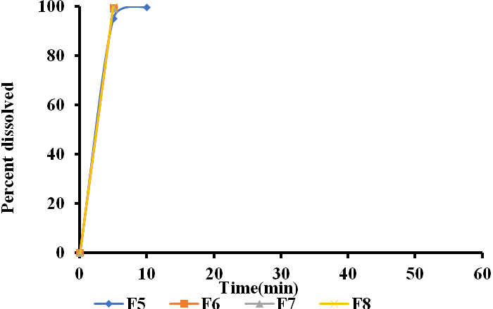 Fig. 10: Dissolution profiles of glipizide fast dissolving tablets prepared employing starch glycolate (F5-F8)