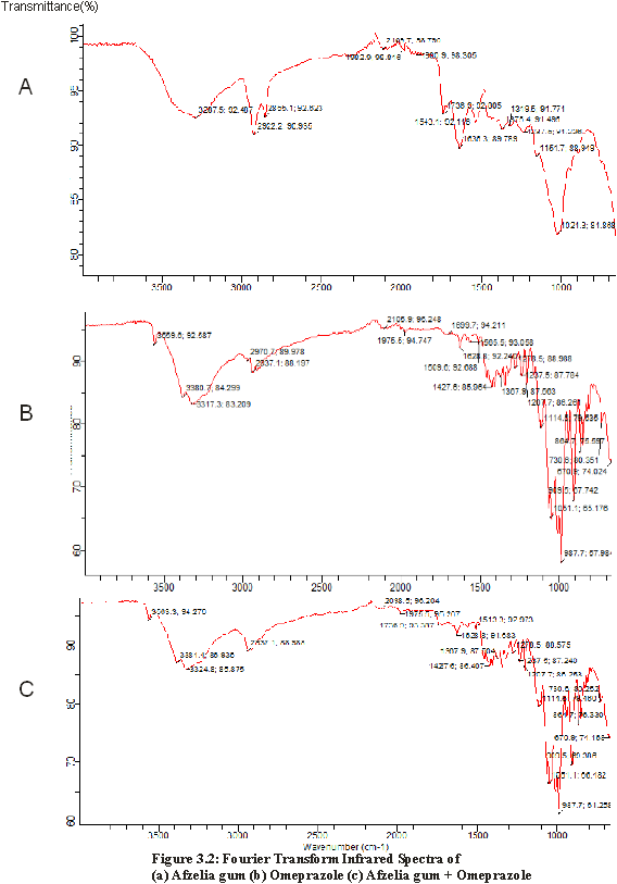 The FTIR spectra of afzelia gum, omeprazole and afzelia gum-omeprazole mixture are shown in fig. 1.