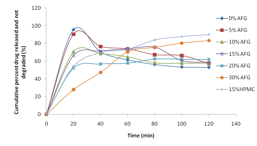 Batch F1 containing 0% AFG was found to be the fastest to dissolve, with 95.7% drug released and available within 20 min but only 53.1% was remaining at time 120 min. Batches F2 and F3 also had their maximum drug release within 20 min with 90.5% and 70.6% drug present respectively. However, less than 60% of the drug was remaining at time 120 min for each of the two batches. There was a gradual drug release from batches F5 and F6 and also gradual drug degradation such that 62.1 and 83.4% were available respectively at time 120 min.