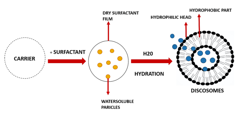 Vesicular drug delivery system is of great latitude in immunology, modelling of biologic membranes, diagnostic techniques, genetic engineering, transport of active pharmaceutical moiety, etc. It is a combination of new dosage forms and advanced techniques that have proved to be far more efficient than conventional dosage forms. This commendatory outlook overthrows the issues of drugs having poor bio-availability and rapid elimination from the body. Trans-dermal delivery is a commonly used route for the delivery of pharmaceutical compounds through dermal diffusion. The solid-lipid particulate system, emulsion-based system, solid lipid tablet, and vesicular system are the 4 kinds of lipid-based drug delivery system [1]. The targeted drug delivery system was embellished by Paul Ehrlich in 1909. The biological origin of vesicles in the delivery of drugs dates back to 1965 by Bingham and was thus named “Bingham bodies” [2]. The incorporation of a drug into vesicular structures in a system extends the bio-availability of the drug in systemic circulation and boosts its efficacy. It also alleviates toxicological effects that have been a source of hindrance in every novel drug discovery [3]. Vesicles are formed from a wide range of extremely organized amphiphilic building blocks. These building blocks confront water to incarnate as a vesicular system. Vesicular systems are defined as ordered assemblies of one or many concentric lipid bilayers. The primary objective of a vesicular drug delivery system is to deliver the therapeutic drug entity selectively to the desired site of action (receptor or organ) and restrict the drug concentration in remnant tissues. Hence the drug distribution is restricted, by en-capsuling it into a carrier system, either by structural alteration OF the drug molecule or modulation of the drug input into the biological environment [4]. It maintains the concentration of the drug at an optimum therapeutic level at the targeted site and precludes the requirement for repeated dosing. Discosomes improve the therapeutic index, stability, solubility, and rapid dissolution of the drug [5]. The different types of carriers are particulate or colloidal carriers, polymeric carriers, macro-molecular carriers, and cellular carriers. They are utilized to overcome the limited permeation of drugs into body tissues [6]. The carriers or chemical derivation may help to constrain the activity of a drug spatially in a diseased organ or tissues adjacent to it [7]. The formulator must also give due contemplation to the tolerance and stability of the final drug product, along with bio-availability. The ideal final formulation should be a combination of all these mentioned attributes [8].