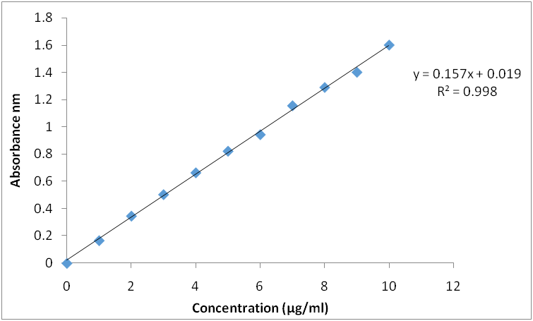 A stock solution of (1 mg/ml) of standard drug was prepared; the 1 ml of stock solution was further diluted with 100 ml 0.1 N HCl to get 10 μg/ml (working standard). later required dilutions (1μg, 2μg, 3μg, 4μg, 5μg, 6μg, 7μg, 8μg, 9μg and 10μg drug per ml solution) were made with 0.1N HCl To a series of 10 ml volumetric flasks aliquots standard solutions were taken and the volume was made up using a 0.1N HCl. The absorbance of these solutions was measured at respective wave length of maximum absorbance (239 nm) in UV Visible spectrophotometer. Standard calibration curve was obtained by plotting Absorbance values against respective concentration.