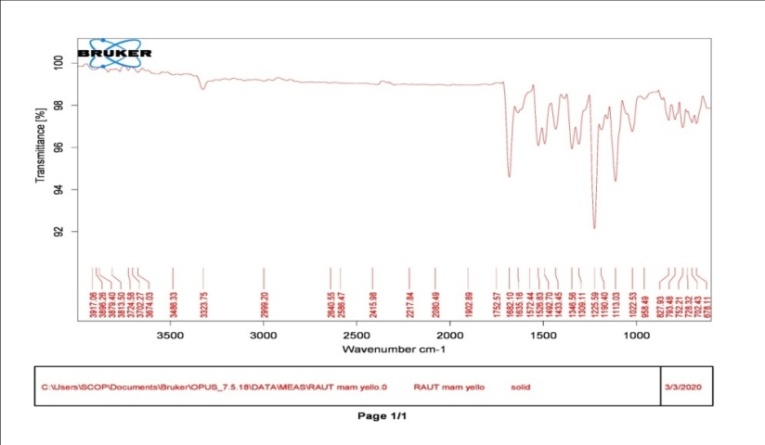 The infrared spectra of pure drug and mixture of polymers and excipients were studied by FT IR spectroscopy using the KBR. The KBr discs were prepared by compressing the powders at pressure of 5 tons for 5 min. in a hydraulic press. Scans were obtained at a resolution of 4 cm-1; from 4000 to 600 cm-1 here spectral changes in the mixture are the basis for the determination of compatibility. The obtained spectrums of different formulation combinations were shown below. The spectral analysis of the pure drug and excipients mixture were done [17].