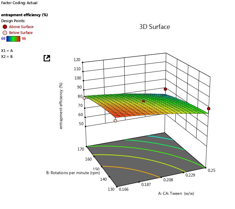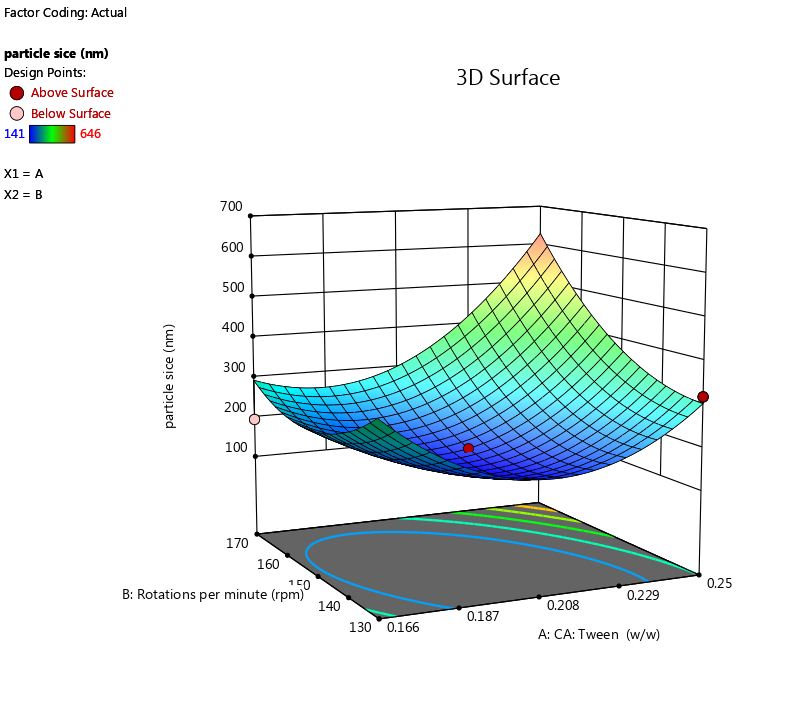 Fig. 5A presents the effect of different factors on the mean PS. These investigated factors were X1= lipid: surfactant w/w ratio and X2= Rotations per minute (RPM) from the presented figure, it is evident that both factors showed significant effects on the mean PS (p-values<0.001). It was manifest that increasing the Tween 80 in case of factor (X1) and RPM in case of factor (X2) led to a significant decrease in the mean PS produced lipotomes with smaller particle size [19].