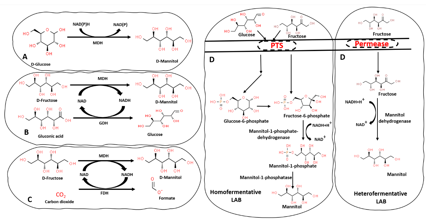 There are many methods through which mannitol is either extracted naturally (Plants) or produced via different chemical or microbial and biosynthesis methods. For mannitol extraction from plants sources, supercritical fluid and subcritical fluid technology was extensively employed [41, 42]. In the chemical synthesis method, mannitol production is induced in the presence of catalyst by the hydrogenation of D-glucose and D-fructose mixtures [43-45]. In the enzymatic method, the conversion of D-fructose directly into D-mannitol allowed in the vicinity of MDH and FDH allowed in presence of cofactors (NADH or NADPH) (fig. 4A, 4B and 4C) [46, 47]. In the fermentation method production of mannitol is done via reduction of different substrates such as fructose, glucose, glycerol, and sucrose via different microorganism strains such as Aspergillus candidus, Lactobacillus intermedius, Candida Parapsilosis, Penicillium (fig. 4) [48-53]. Further to increase mannitol production, engineered strain prepared by knocked out technology such as Lactobacillus lactis, Leuconostoc pseudomesenteroides. S. cerevisiae etc [54-58]. Currently, recombinant strain of Escherichia coli with insertion of other strain genes encoded to increase or facilitate production most commonly employed (fig. 4) [59-61].