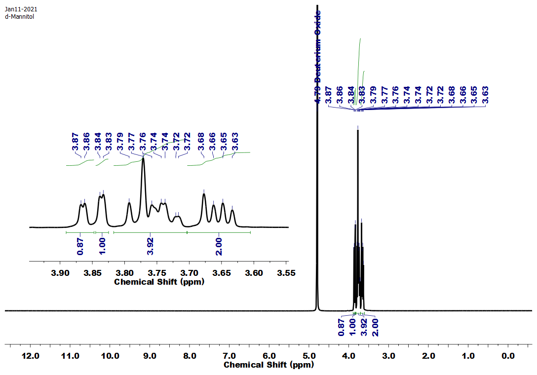 The UV spectrophotometry, IR, and H1 NMR graphs of mannitol are shown under fig. 6, 7, and 8, respectively.