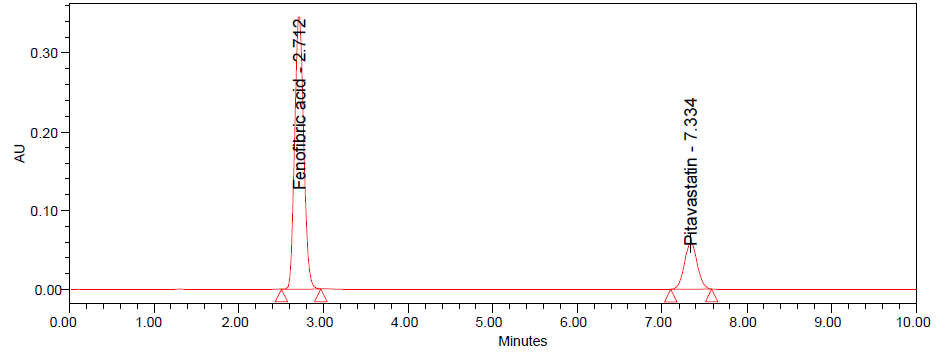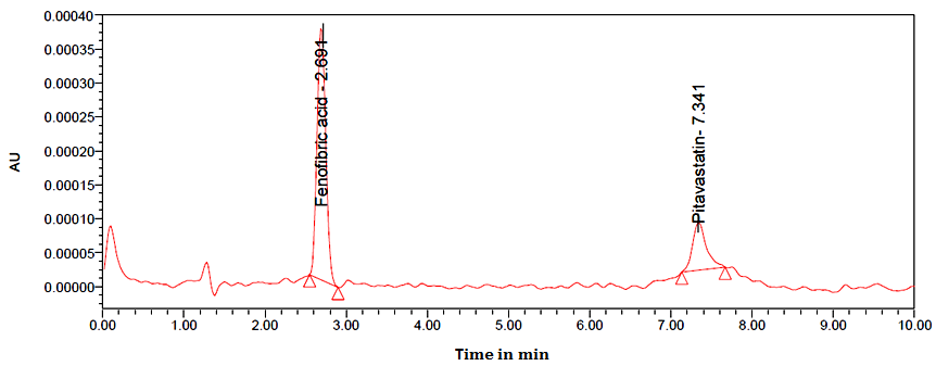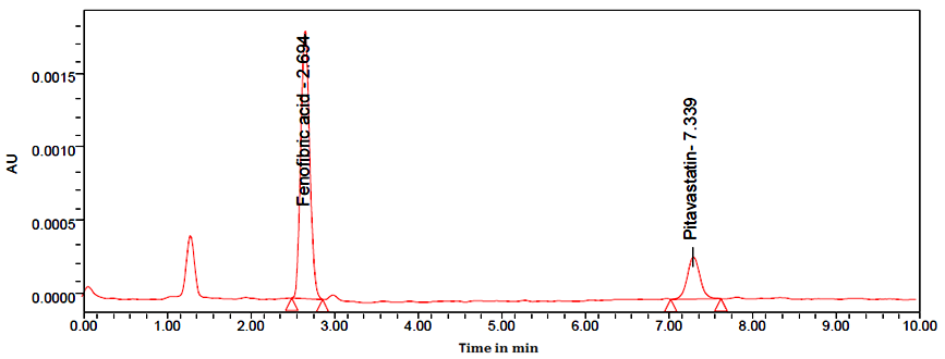 Six replicates of a standard solution containing Fenofibric acid (175μg/ml) and Pitavastatin (10μg/ml) were analysed on the same day. Peak areas were calculated, which were used to calculate mean, SD and %RSD values.