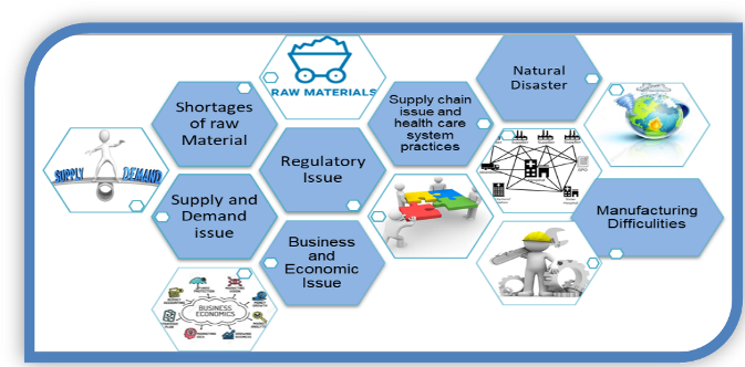There are many reasons for drug shortages. Some of the main reasons are Manufacturing Difficulties, Natural Disasters, Supply and Demand Issues, Business and Economic Issues, needs of Raw Materials, Regulatory Issues, Supply Chain Issues, and Health Care System Practices [4] (fig. 1).