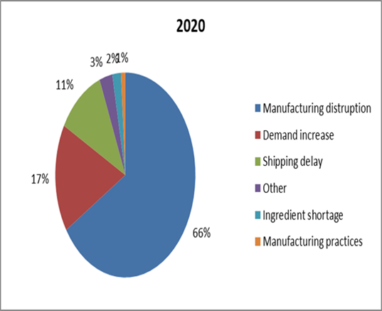 Drug shortage program, as of March 2019 to April 2020, Manufacturing problem(66%), demand increase (17%), shipping delay(11%), ingredient shortage(2%), manufacturing practices (1%). where the most common known causes of shortages. However, the other 3% of drug shortages were classified as an "unknown" cause [23, 24] (fig. 2).