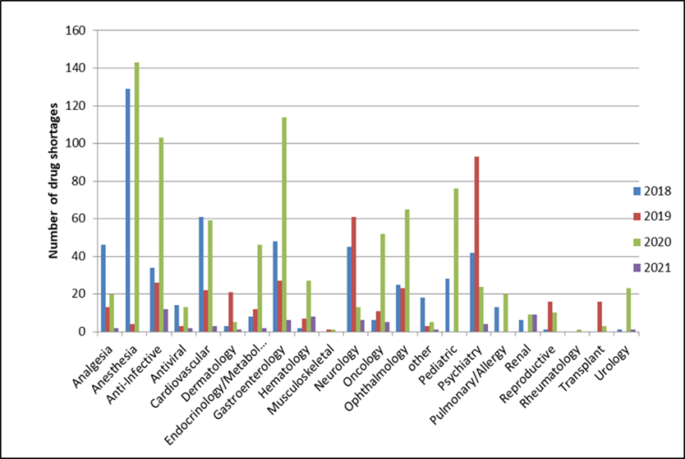 Results: On assessment based on the report, the number of shortage drugs in 2020 is 835; Anesthesia drugs are highest during the COVID-19 outbreak data indicate the number of shortages is 143 in USA. It was found that generic products were mostly in short supply, with antimicrobial agents (63%) topping the list of therapeutic categories of medicines with interrupted supply, followed by oncology medicines (47%) and then anesthetic agents (38%) during COVID-19 pandemic.