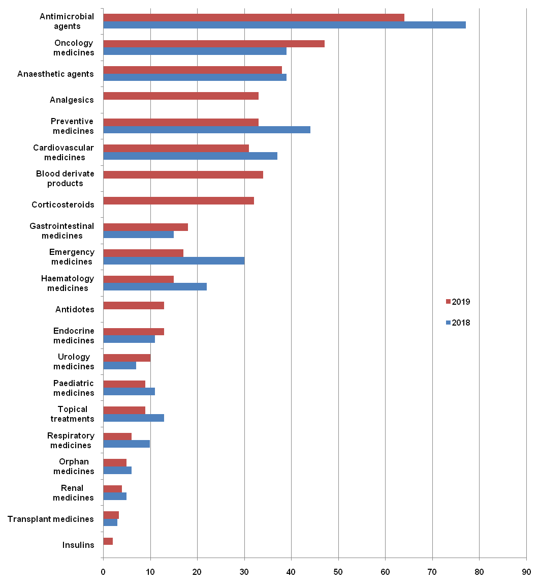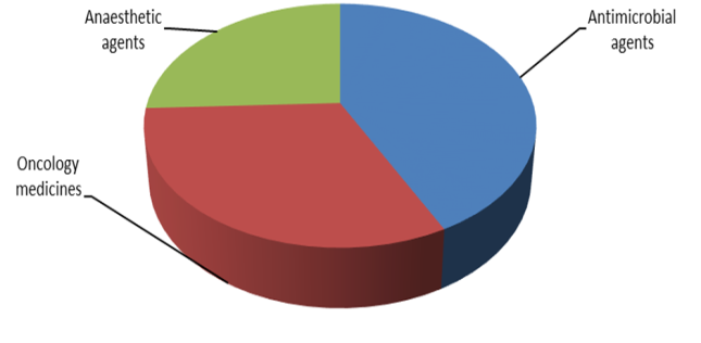 Through this study, it was found that generic products were mostly in short supply, with antimicrobial agents (63%) topping the list of therapeutic categories of medicines with interrupted supply, followed by oncology medicines (47%) and then anesthetic agents (38%) were named by hospital pharmacists as top three medicines frequently in shortage in 2019 (fig. 5).
