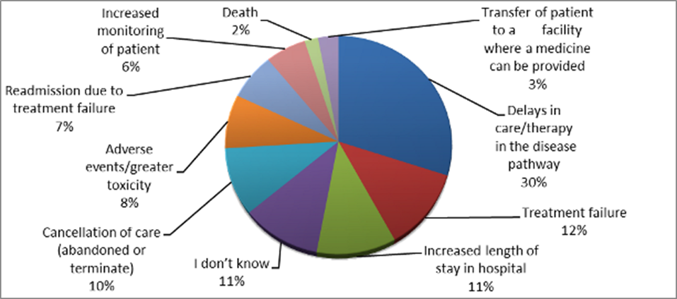 The impact is resulting from medicines shortages on the patients, which highlights the magnitude of this problem. 30% of the respondents responded to care delayed due to medicine shortages, 12% experienced a failure of treatment, and 11% had an increased length of stay in the hospital. 10% of the patients had their treatment canceled, while 8% experienced adverse events or more significant toxicity. Readmission due to treatment failure 7% and increased monitoring were presented by 6% of the population; in addition, 3% (of the patients were transferred to a facility where a pharmacist could provide the medicine. 2% of respondents answered that they knew of instances where the death had occurred due to medicines shortages. 11% stated that they didn't know what type of impact the medicine shortage had on their treatment (fig. 7).