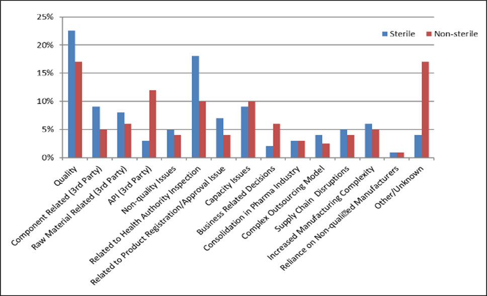 As per the 2013 ISPE drug shortage report [28], in the case of sterile products, we found that quality-related issues contribute to most of the drug shortage (23%), followed by health Authority inspection-related problems (18%). Both components-related (3rd party) and capacity issues contribute 9% of drug shortage. Whereas business-related decisions, Reliance on Non-qualified manufacturer is the least factors, i.e., contributing 2 %, 1% of the drug shortage, respectively. But in the case of non-sterile products, both Quality and other/unknown related issues contribute 17% of a drug shortage, followed by API-related issues (12%), and again, Reliance on Non-qualified manufacturers are the least factor contributing only 1% of non-sterile product shortage (fig. 8).