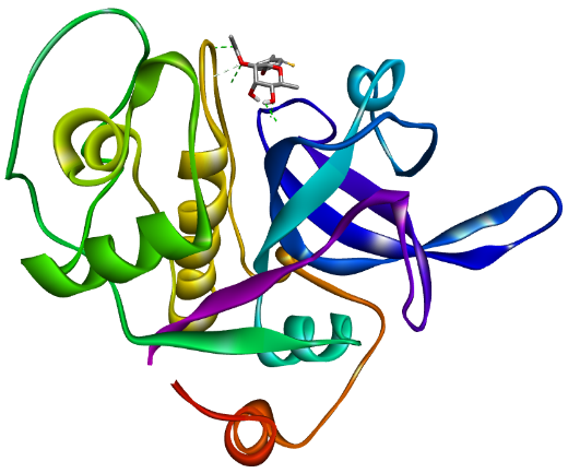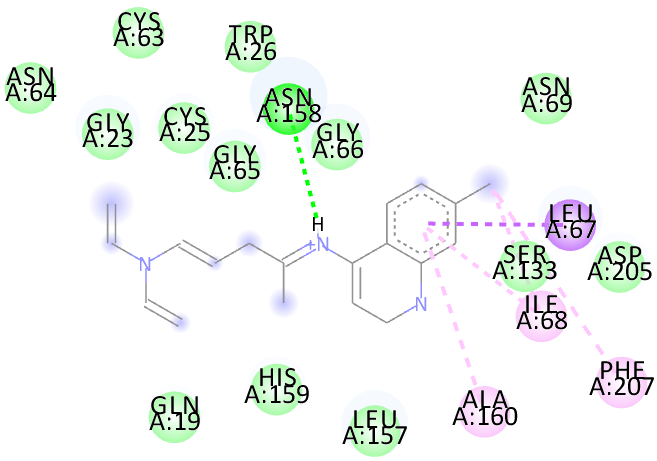 Result docking analysis is should also notice the interaction between ligand with active site residue. His159 and Cys25 residues are the active sites in the surface layer of cysteine protease responsible for the proliferation of falciparum erythrocyte [43]. Ligand 6 and C make Van der Waals link at His159 and Cys25 with its affinities -5.3 Kcal/mol and -6.3 kcal/mol, respectively. Ligand 8, with the lowest affinity (-6.6 Kcal/mol), has hydrogen bond interaction between His159 and the hydroxy group of tetrahydropyran. The Cys25 forms. Van der Waals bonds around the sulfur double bond (fig. 3). Hydrogen bonds in the complex's residue ligand are much stronger than the Van der Waals; they stabilize the complex bonds and reduce affinity energy.