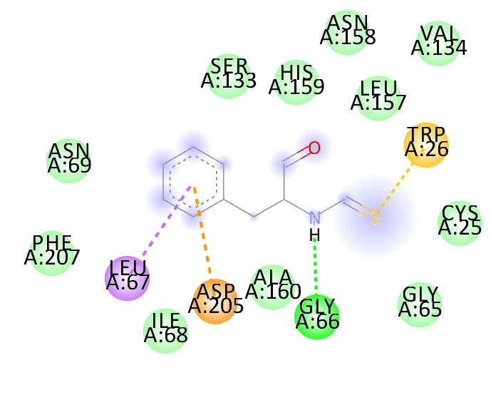 As starting material, eugenol has the same affinity with the cinnamaldehyde complex (table 1). However, OH-eugenol is predicted to inhibit the ITC group's entry, and methylation is required to form methyl eugenol (ME). It was showed that ME increased the stability complex and has a better affinity (AG =-5.2 Kcal/mol) than eugenol. Methyl eugenol isothiocyanate (ME-ITC) or 4-(2-isothiocyanatopropyl)-1,2-dimethoxybenzene has affinity -4.9 Kcal/mol. Inserting the ITC group into cinnamaldehyde resulted in 2 types of ITC prediction, namely 3-isothiocyanato-3-phenylpropanal (ligand 5) and 2-isothiocyanato-3-phenylpropanal (ligand 6). The affinity score of ligand 6 is better than its derivatives. However, both ME-ITC (ligand 3) and cinnamaldehyde-ITCs (ligand 5 and 6) could not achieve chloroquine affinity and natural ITC from Moringa oleifera leaves (ligands 7, 8. 9, and 10). In general, ligands 8 and 10 have better affinity than chloroquine. It is in accordance with the local tradition of using Moringa oleifera leaves as a traditional malaria medicine. Ligand 8 has the best energy affinity compared to chloroquine and other ligands (table 1).