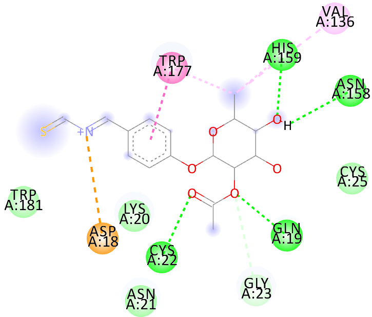 The common structure of compounds (1, 2, 4, and C) was collected in fig. 1. Novel designed-ITC (3, 5, 6) compounds (fig. 1) and ITC derived from Moringa oleifera leaves (7, 8, 9, and 10) were constructed and converted to 3D by MarvinSketch (fig. 2). Receptor PDB ID 1YVB was obtained from the RCSB protein databank. All compounds were prepared into ligands by adding charge and hydrogen using the Chimera 1.13.1 program with the AMBERff12SB standard and Gesteiger method. The receptor was prepared and purified from water, native ligands, and its optimization was carried out by adding charge AM1-BCC and hydrogen. Molecular docking was done by PyRx and the grid dimension set as a center at x = 83.731069686; y =-36.3469508554, z =-92.6668557437 then size point of x, y and z as 25 Ǻ, 25 Ǻ, and 25 Ǻ respectively. Interaction of ligand with receptor was determined using affinity binding (Kcal/mol). The 3D complex structures were visualized through Discovery Studio Visualizer 2019 client.
