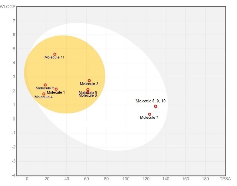 Fig. 4: Boiled-Egg model of all ligands: white area = GI absorption, yolk area = BBB