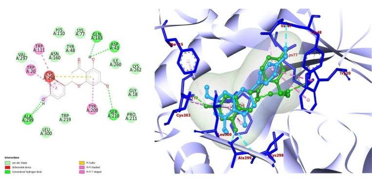 Fig. 1: The left-sided diagram shows the 2D amino acid interactions of Naringenin with human aldose reductase receptors. The right-sided diagram shows the binding analysis of Naringenin (light blue) at the active site of the co-crystallized/native ligand (deep green) of the receptor human aldose reductase. In the right-sided diagram, protein is represented in light violet color, whereas, the amino acid residues are represented in deep blue color