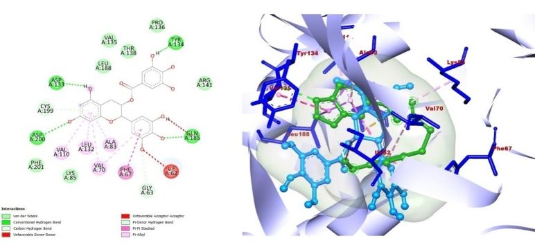 Fig. 2: The left-sided diagram shows the 2D amino acid interactions of epigallocatechin with mitogen synthase kinase receptor. The right-sided diagram shows the binding analysis of Epigallocatechin (light blue) at the active site of the co-crystallized/native ligand (deep green) of the receptor mitogen synthase kinase. In the right-sided diagram, protein is represented in light violet color, whereas, the amino acid residues are represented in deep blue color