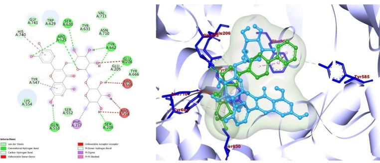 Fig. 3: The left-sided diagram shows the 2D amino acid interactions of Rutin with the dipeptidyl peptidase-IV receptor. The right-sided diagram shows the binding analysis of Rutin (light blue) at the active site of the co-crystallized/native ligand (deep green) of the receptor dipeptidyl peptidase-IV. In the right-sided diagram, protein is represented in light violet color, whereas, the amino acid residues are represented in deep blue color