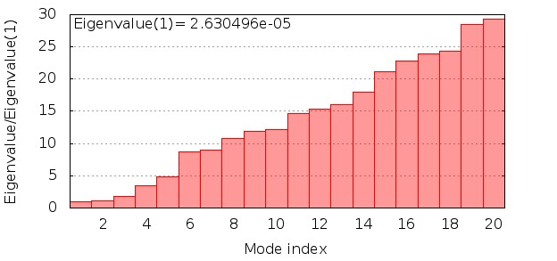 Fig. 5: Eigenvalues (The eigenvalue associated to each normal mode represents the motion stiffness. Its value is directly related to the energy required to deform the structure. The lower the eigenvalue, the easier the deformation)