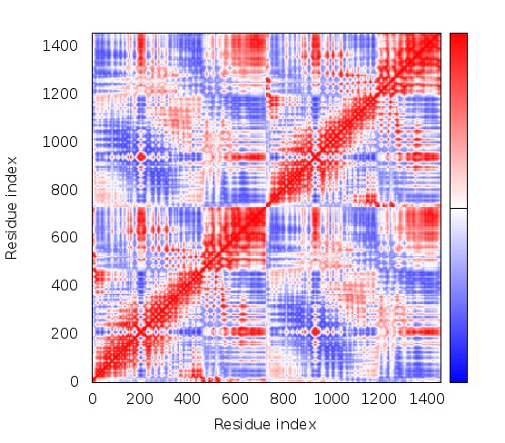 Fig. 7: Covariance map (correlated (red), uncorrelated (white) or anti-correlated (blue) motions of coupled residues)