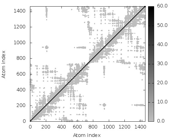 Fig. 8: Elastic network (Each dot denotes one spring within the respective atoms pair. The dots are colored based on the stiffness where the dark grey dots indicate the stiffer springs and vice versa)