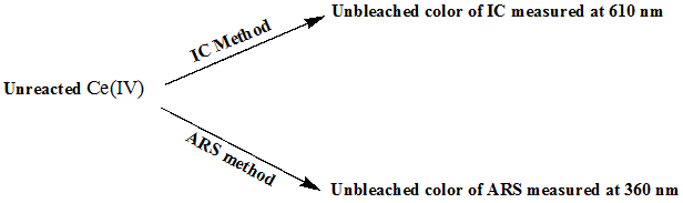 2. Determination of the residual cerium(IV) by reacting it with a fixed amount of IC or ARS dyes and measuring the increase in absorbance at λmax 610 and 360 nm, respectively (Scheme 1) (fig. 2a and 2b).