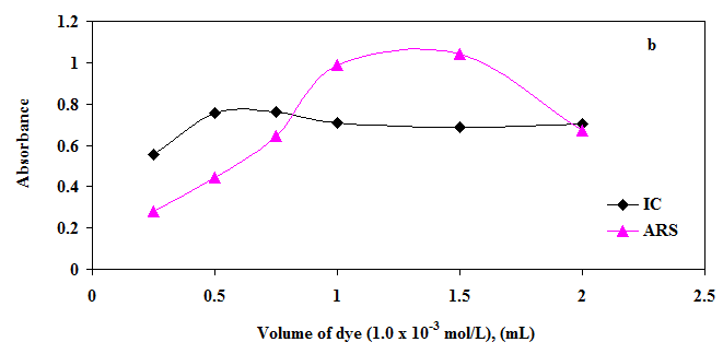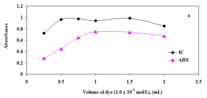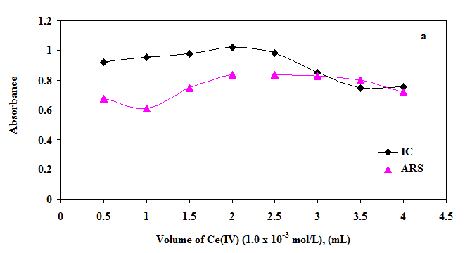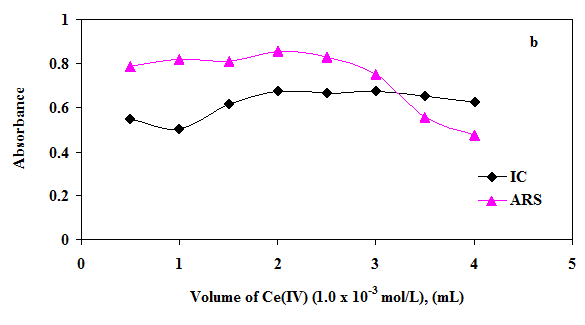 The effect of IC or ARS dye concentration on the intensity of the color developed was carried out to obtain the optimum concentration of dyes that produces the maximum and reproducible color intensity by reducing the residual of cerium (IV). The effect dye concentration was studied using different volumes (0.25–2.0 ml) of the studied dyes (1.0 × 10-3 mol/l) (fig. 4a and 4b). It was observed that maximum color intensity of the oxidation products was achieved with 0.5 and 1.0 ml of IC and ARS dye solution, respectively. The color was found to be stable up to 10 h.