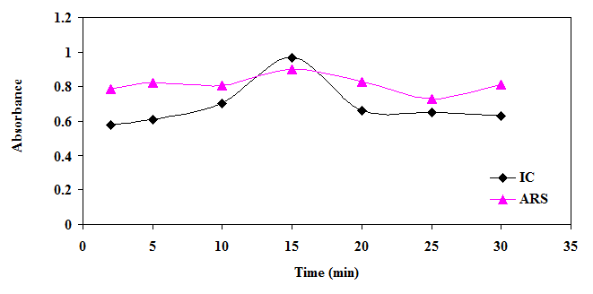 A stock solutions (1.0 × 10-3 mol/l) IC and ARS (Sigma-aldrish, USA) were first prepared by dissolving accurately weighed 46 mg and 24 mg of IC and ARS, respectively in bidistilled water and diluting to volume in a 100 ml calibrated flask.