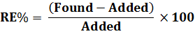 To evaluate the accuracy and precision of the proposed methods, intraday and inter-day determination of SOD and DAC at three different concentrations for each method were prepared and analyzed. The intraday studies were performed in one day and inter-day studies in five days (for each level n=6). The percentage relative error (RE%) was calculated using the following equation: