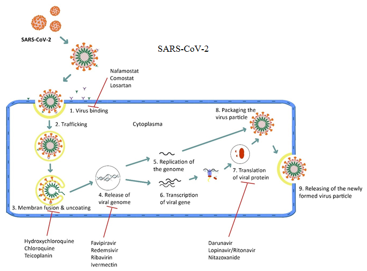 Fig. 2: Picture of the mechanism by which the virus infects human cells and what drugs prevent it [1]