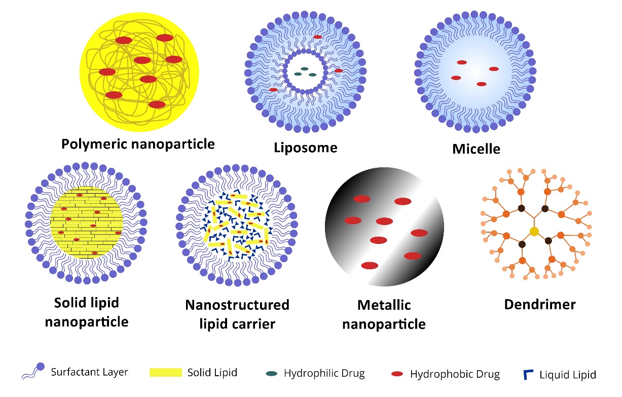The SLN consists of a phospholipid lining a solid hydrophobic central matrix (containing the hydrophobic tail of the phospholipid). The SLN also contains solid lipids, emulsifiers and also active pharmaceutical ingredients (APIs). APIs that are incorporated into SLN include drugs, proteins, plasmids, DNA, and genes. The lipids used in the SLN formation are surfactants which are thus stabilized at physiological temperature and are solid in room form. Based on its structure, the lipid is divided into fatty alcohols, fatty acids, fatty esters, triglycerides and partial triglycerides. Emulgators that are widely used in SLN are nonionic polymers, ionic polymers, surfactants and organic salts [66].