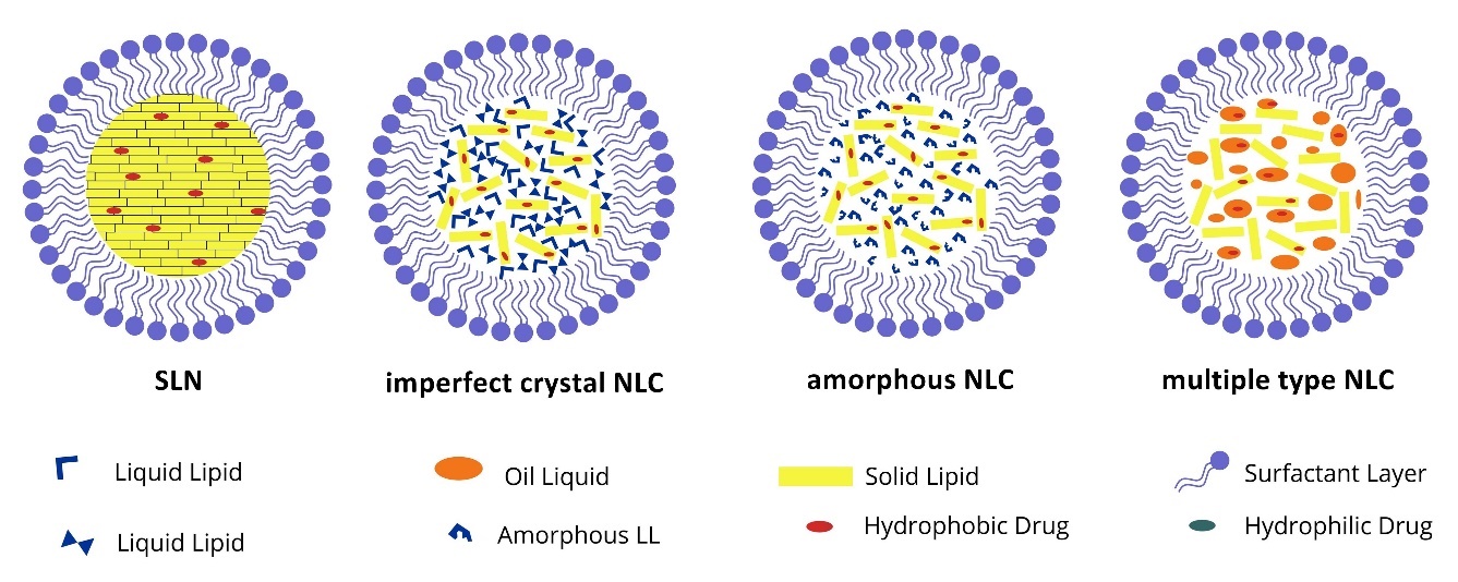 Nanostructured lipid carrier (NLC) is a drug delivery system consisting of a combination of solid and liquid lipids as its core matrix, with sizes between 10-1000 nm [72, 73]. The basic ingredients for making NLC are biodegradable and biocompatible (solid and liquid) lipids and emulsifiers [73]. This NLC is a development of SLN in order to overcome the weaknesses of SLN [74]. SLN has advantages because it uses physiological lipids, it does not use organic solvents, and it can be applied on the production scale. As an SLN delivery system, it can increase bioavailability, protect the drug from the environment, and have a controlled release character. However, SLN also has disadvantages, including unpredictable gelation tendency, polymorphy transition, low incorporation caused by the solid lipid crystal structure, drug release from the matrix during storage [72, 75]. The NLC formulation is based on incorporating the drug in a mixture of various ratios of solid and liquid lipids. NLC is designed to produce less/no crystalline matrix in the compacted core to overcome the weakness of SLN. The preparation method between SLN and NLC is not different, the difference between the two is in the composition of the core/matrix [75]. Core NLC is made from a mixture of solid and liquid lipids, which form an imperfect crystalline interior that aims to improve the capacity of the drug. The liquid phase in NLC inhibits drug release during storage [67]. The addition of liquid lipids to the NLC matrix is a fundamental step, as it significantly increases its properties compared to SLN [76].