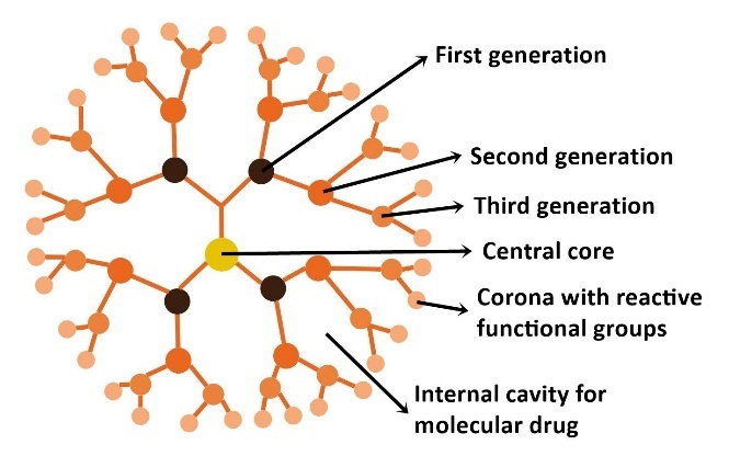 Dendrimer is a globular macromolecule with an architecture consisting of three distinct domains: the central core, the branched mantle, and the corona with peripheral reactive functional groups. Dendrimer has a size of 1-100 nm [79]. The name dendrimer was introduced by Tomalia from two Latin words that is dendros, which means tree, and meros, which means part [80]. So that dendrimer can also be defined as a polymer group with high regularity, 3-dimensional shape, and is a functional polymer like a tree. In contrast to classical random coil polymers, dendrimers have a special architecture consisting of a central core, hyper-branch mantle/interior layer, corona with reactive group functional groups in the outermost branch unit [79, 81]. The central core consists of 1 atom or a group of atoms that have at least 2 chemical functionalities that can be bonded as branches. Interior layers are unit repetitions that have at least one branch where the repetitions are arranged in a geometrical progression to produce a series of concentric radial layers called generations (fig. 5). Corona is the outermost layer of macromolecules that determines the efficacy of nucleic acid complexes or trapped drugs [82].