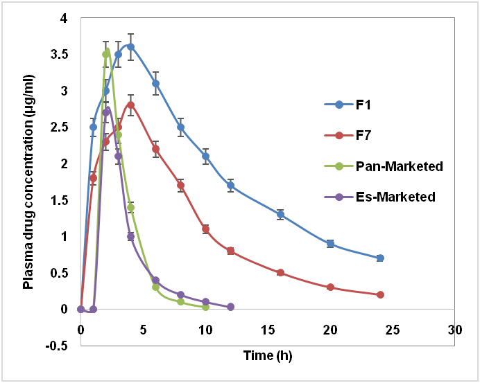 The absorption of pantoprazole and esomeprazole was rapid in marketed formulation than the formulated transdermal patches; the mean tmax of the marketed pantoprazole and esomeprazole was found to be 2 h, while in the tested transdermal patches F1 and F7, the mean tmax was around 4 h. This shows that the formulated transdermal patches were effective in delaying the peak plasma concentration of pantoprazole and esomeprazole. The time to achieve maximum plasma concentrations of PPIs following administration of the marketed tablets used in this study showed relatively 2 h post-dose between the subjects studied. This is probably a result of the use of an enteric-coated formulation. A similar study was conducted by Pue et al., which showed the relative variability of 2-4 h in the subjects treated with pantoprazole [25].