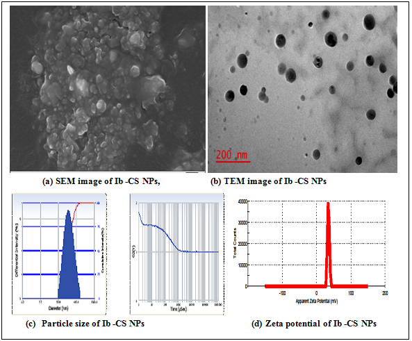Ib-CS NPs were prepared by the Ionotropic gelation method. This method was used to prepare the desired NPs and is considered to be adequate nanocarriers for the encapsulation of drugs due to its easy methodology, cost-effectiveness, and non-toxic nature, and formulated NPs were characterized by SEM, TEM and DLS studies for particle size, shape and morphology determination [41]. The prepared Ib-CS NPs were found in the nano range, and their spherical shapes were confirmed using SEM and TEM in fig. 2 (a and b). The particle size and Zeta potential were analyzed by Malvern Nano Zetasizer as shown in fig. 2 (c and d).
