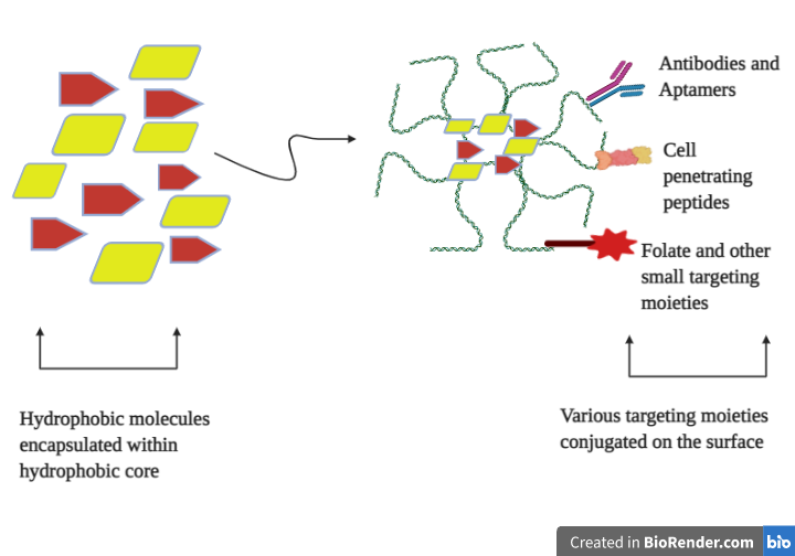 It benefits from diseased tissues, usually tumor, pathophysiological properties, while active targeting by the drug carrier initially uses passive targeting to gather in the tumor zone and then bind to the target cells using ligands to internalize the NPs to the cells [40, 41]. The passive targeting of therapeutics from nanocarrier depends on the tumor microenvironment, the enhanced permeability and retention (EPR) effect, and the tumor pH. Tumor cells expand and proliferate more quickly than normal cells are well established. This cell proliferation has a metabolic rate that requires more nutrients and a larger amount of oxygen. The architecture of normal cells is disturbed and replaced by tumor cells to compensate for nutrients [42]. Passive targeting helps NPs to build up in the tissue through EPR [43]. Ground Shift in PEG NPs. Enhanced NP hydrophobicity associated with higher particle-partisan aggregation and blood opsonization steric deficiency was found [44, 45]. Poloxamins, poloxamins, Polyethylene Glycol (PEG), Poly-Caprolactone (PCL), Poly D, L-lactic-co-Glycolic Acid (PLGA) are the polymers widely used in the manufacture of sterically stable stealth nodes and to improve hydrophillicity [46].