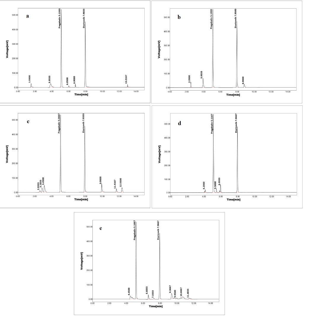 Fig. 1: Chromatograms of PRBN and ETRB in Etoshine NP solution after [a] acid hydrolysis test [b] alkaline hydrolysis test [c] peroxide hydrolysis test [d] thermal hydrolysis test [e] photo hydrolysis test