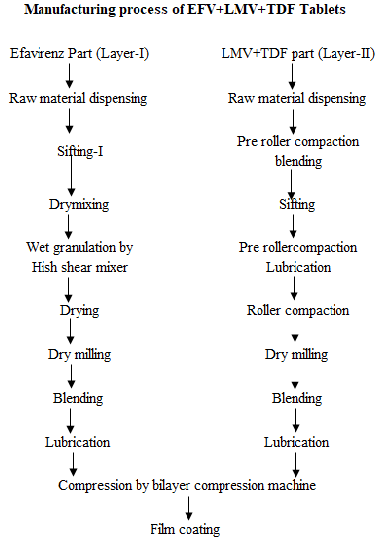 The efavirenz (EFV) layer is prepared by using a wet granulation process to improve the flowability of the granule [13]. The tenofovir disoproxil fumarate/lamivudine (TFL) layer is prepared using a dry granulation process, to protect the tenofovir disoproxil fumarate (TDF) from degradation by absorbing moisture, as it is slightly hygroscopic [14]. During the formulation study, the manufacturing steps required to reach the quality target product profile were identified and proposed for process development. The initial proposal was to use similar qualitative compositions as those of individual reference standards [15-17], but the final composition and manufacturing method was selected based on the physicochemical characteristics of the product development. Based on literature search and previous experience, the proposed manufacturing procedure for the development was designed as below fig. 1.