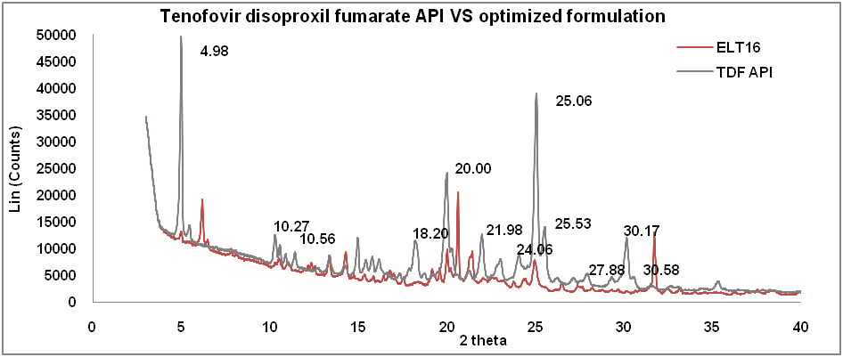 Results: Drug-excipients interaction results revealed that the mixtures of three drug substances in 50 °C/75 % relative humidity (RH) resulted in an increase in tenofovir IMP-E and the highest unknown impurity was significantly increased and additionally decreased tenofovir assay in the presence of efavirenz. Sodium lauryl sulfate is very critical and it acts as a wetting agent and increases the solubility of efavirenz, and directly influences the dissolution of a drug product. Microcrystalline and croscarmellose sodium have a chance to affect the dissolution and friability of tenofovir. Powdered cellulose was acting as a diluent and flow property of the lamivudine part and it also affects the uniformity and dissolution. So, these ranges were optimized. X-ray diffraction (XRD) indicates there are no polymorphic changes for the optimized formulation and there is no interaction between the three active substances, and finally, in vitro dissolution results for the optimized formulation against the reference drugs.