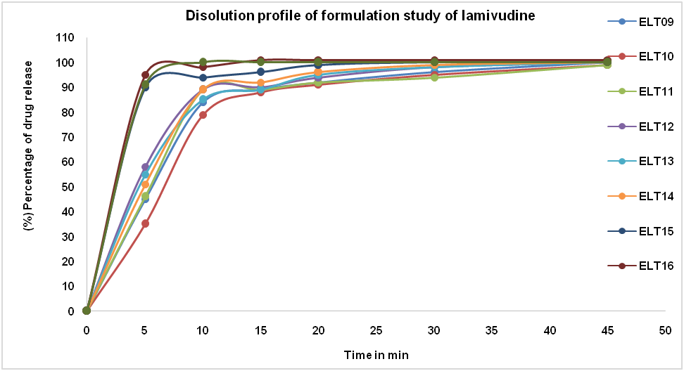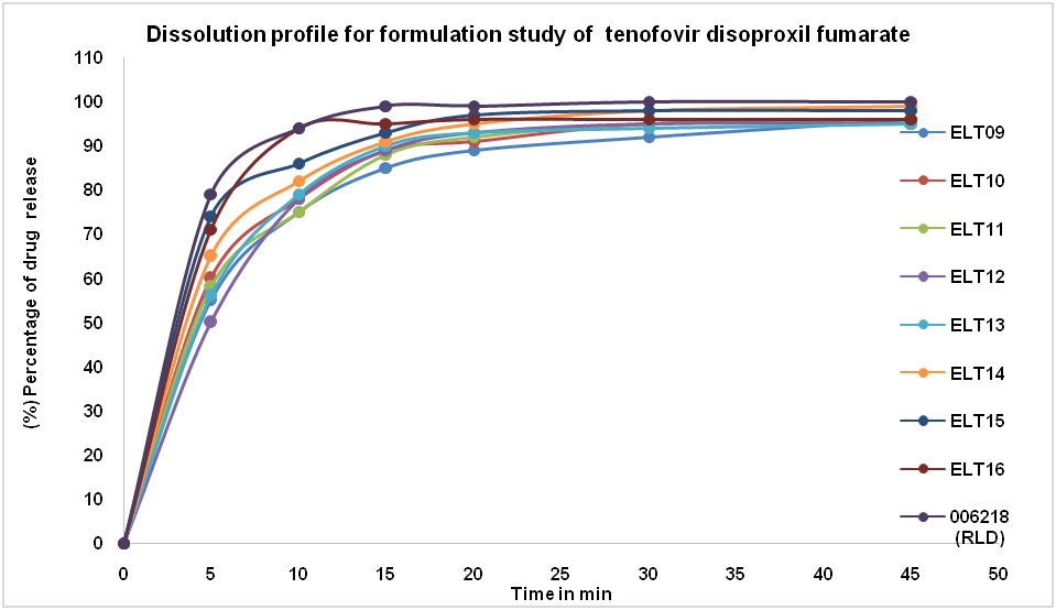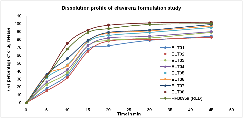 Dissolution was carried out in purified water with 0.5% sodium lauryl sulfate (SLS), volume 900 ml, paddle speed 75 rotates per minute (RPM) for efavirenz and 0.1N hydrochloride, volume: 900 ml, paddle speed, and apparatus: Type-II was used together for the lamivudine and tenofovir disoproxil fumarate. Coated tablets were used for the study of dissolution for the formulation study from ELT0 to ELT16. Further dissolution results for the optimum formulation compared with each innovator product. Results are presented in fig. 11-14 for reference.