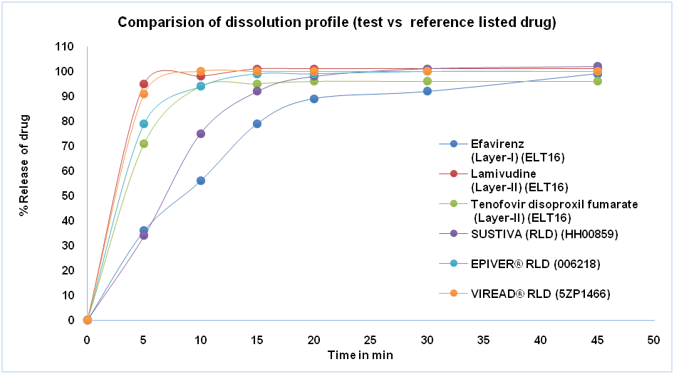 Methods: Bilayer formulation was developed with each blend of layer-I (efavirenz) and layer-II (lamivudine and tenofovir disoproxil fumarate) through wet granulation process and roller compaction process, respectively. Further, both layers were compressed by using bi-layer compression followed by film coating. Layer-I and II formulations were developed by using various concentrations of diluents, surfactants, and disintegrants to improve the solubility of efavirenz and improve the flowability and uniformity of layer-II. Finally, the optimum formulation was developed to compare the in vitro dissolution with each branded formulation.